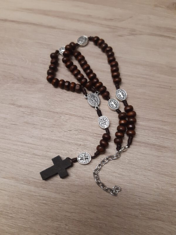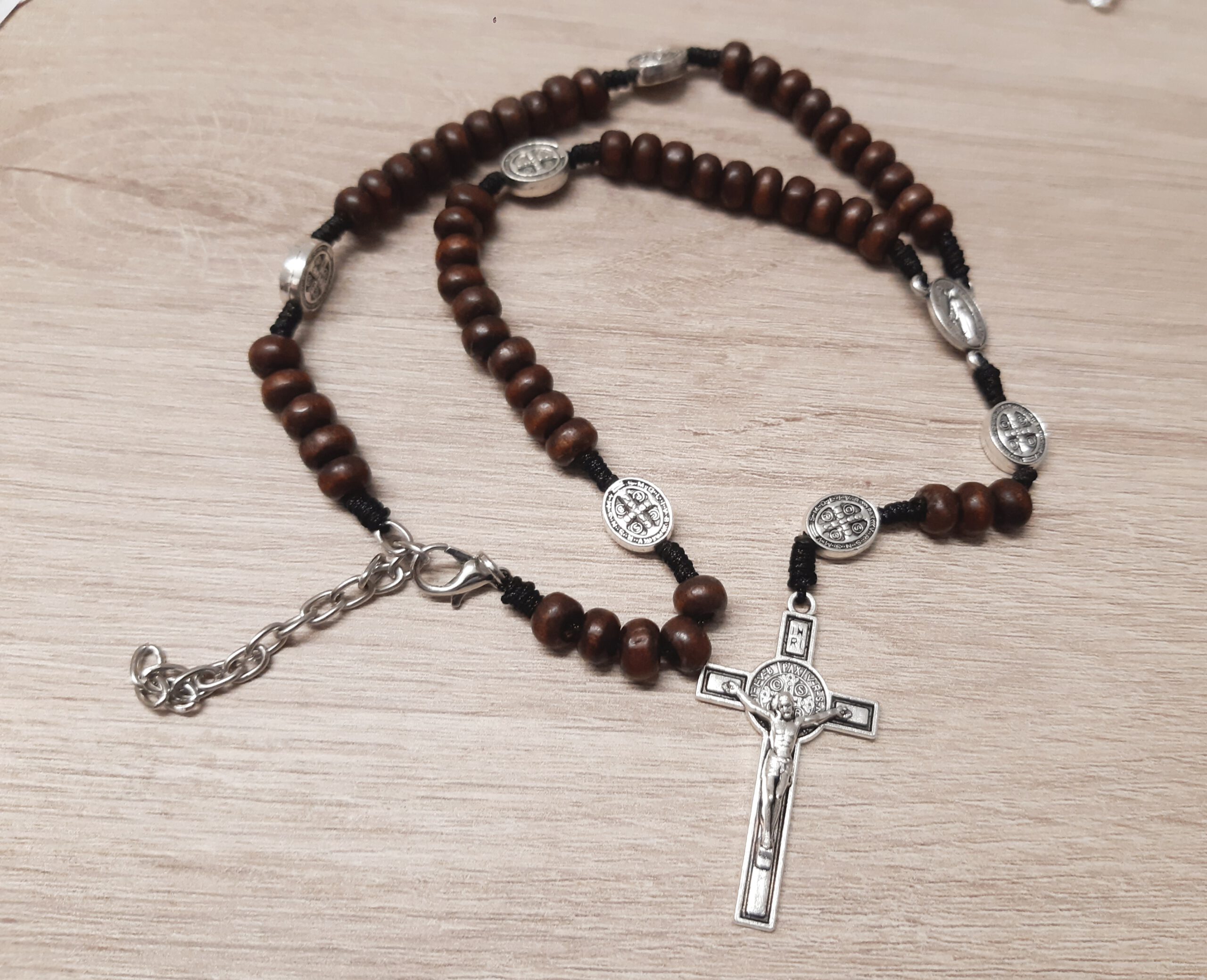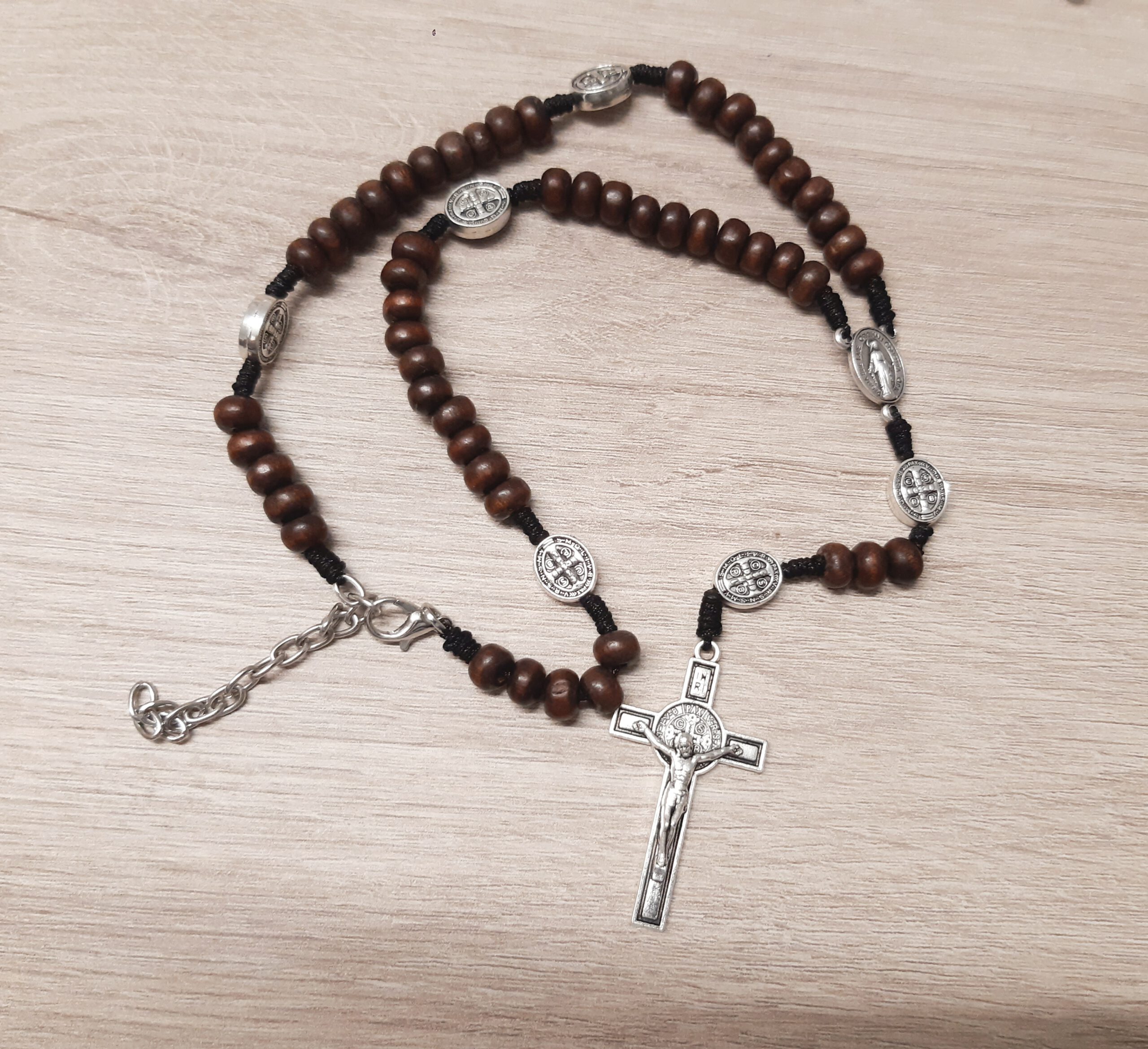Rosario católico con cuentas de madera artesanal de 6mm, medalla y Cruz de San Benito.