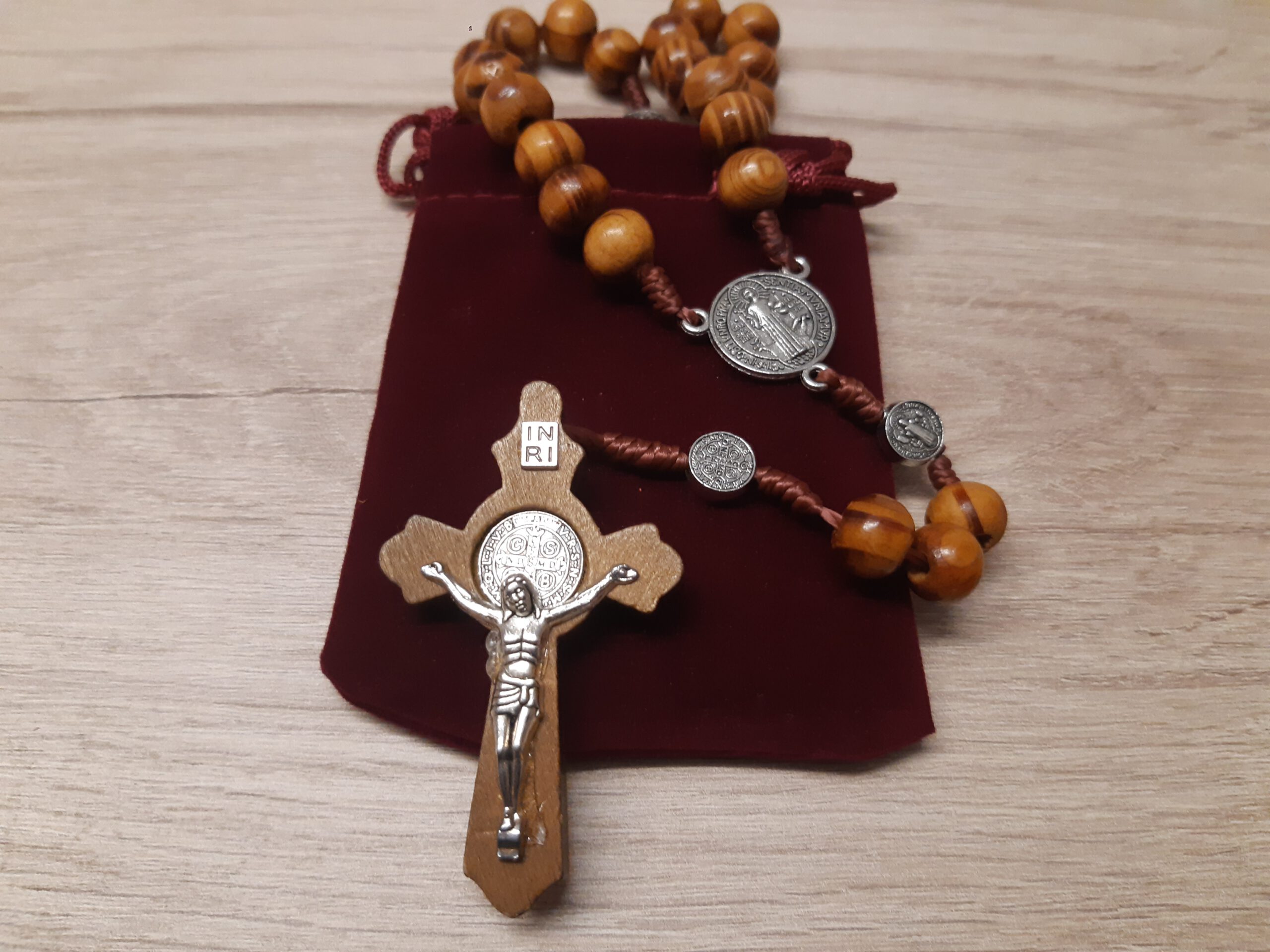 Rosario católico con cuentas de madera artesanal de 10mm, medalla y Cruz de San Benito.